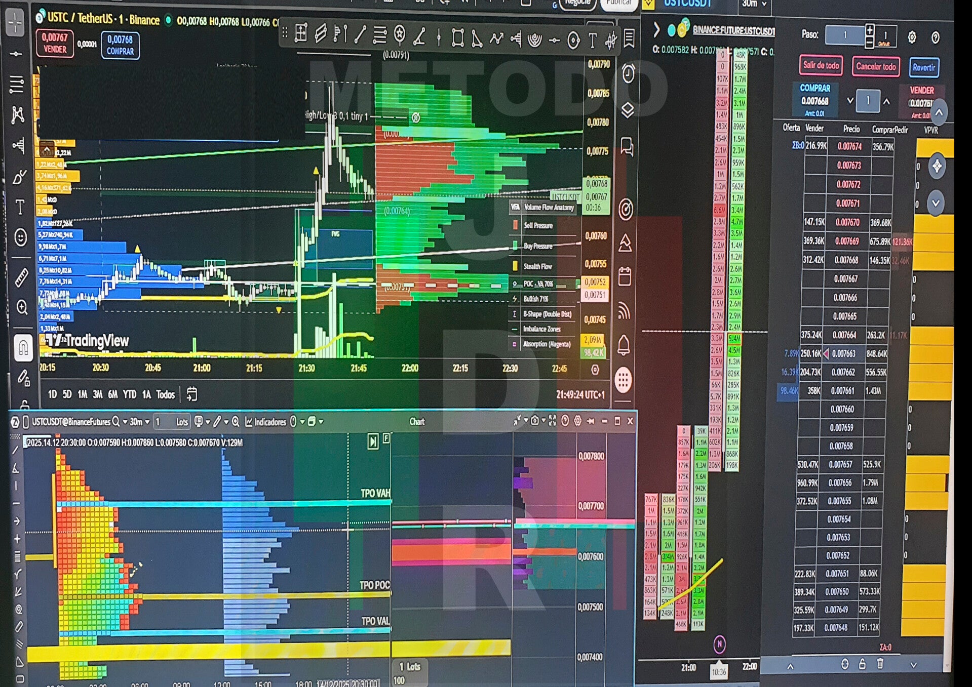 Aquí se trabaja con herramientas de lectura interna del precio, flujo de órdenes, perfiles de volumen, zonas de absorción, desequilibrios, presión compradora y vendedora, y participación profesional real.